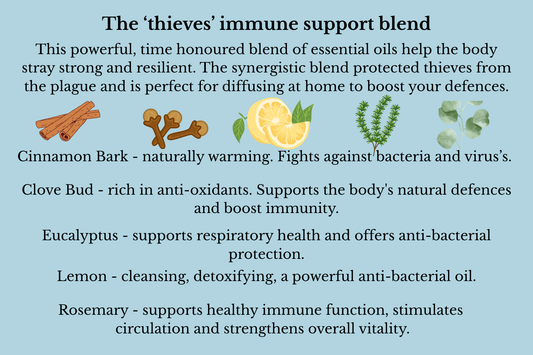 Aromatherapy ‘Medicine Cabinet’ Immune Support 'Thieves' blend. blend of essential oils of Cinnamon Bark, Clove Bud, Eucalyptus, Lemon and Rosemary. 10ml