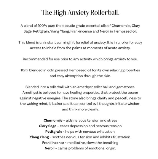 Aromatherapy Rollerball - The High Anxiety Support Rollerball. Pure therapeutic essential oil blend with amethyst crystals.Support for acute anxiety.