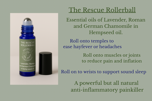 Aromatherapy rollerball - The Rescue Rollerball, with essential oils of Lavender, Roman and German Chamomile in hemp seed oil to ease headaches, hayfever and pain.10ml