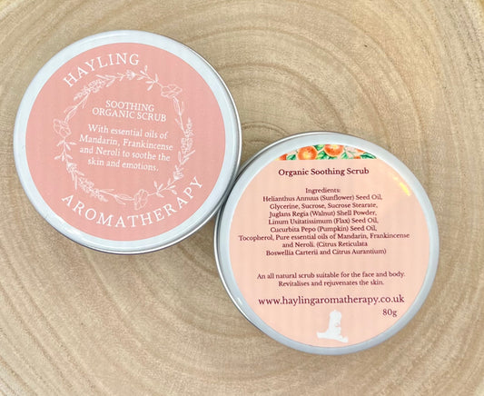 Organic aromatherapy soothing scrub with essential oils of mandarin frankincense and neroli & natural oils, butters,sugar and walnut shell