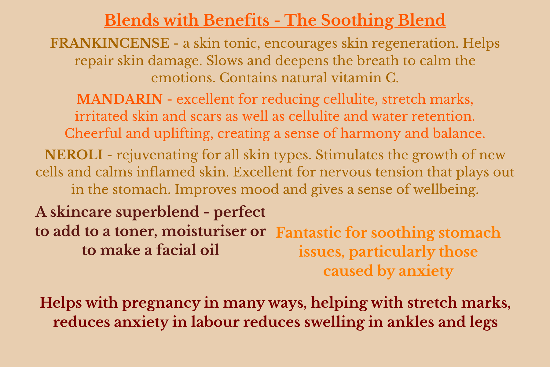 Mandarin - A tonic for the digestive system, it can alleviate bloating and constipation. Excellent for the prevention of stretch marks. Mandarin contains antioxidants and vitamins that promote skin regeneration and improves the skins elasticity. Mandarin is a very gentle oil. It stimulates the lymphatic system which may aid reducing fluid retention.